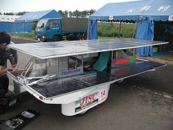 ![]() ようやくお披露目、玉川大学さんの玉川ハイブリッドソーラーカー。FCクラスに出場です。シンプルだけどおしゃれなデザイン。 |