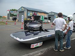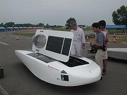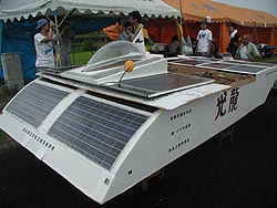 ![]() 鶴岡高専太陽エネルギー研究会さんのGreenLeaf IX。あれ?ポチは?・・・。 ご覧のように今年は二段構えのパネル。充電効率を追求したデザイン。ドアはスライド式。ん〜、ハンパじゃないね。 |