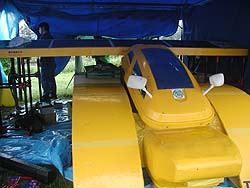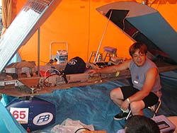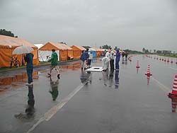 ![]() 車検だというのに雨。 昨夜からの雨でキャンプ村もピット前も水浸しです。 |