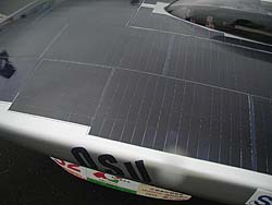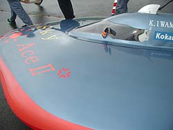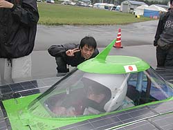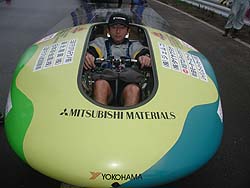 ![]() 三菱マテリアルさん。 「レース前は黒で引き締め、レース中は赤で盛り上げる」とユニフォームを準備。この角度で撮すと丸いマシンに見えますね。 |