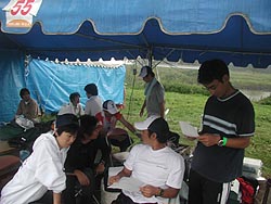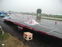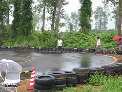![]() 折り返し地点。 通過するマシンの気配無し。 それでもボランティアさんたちは決して暇ではありません。時々雨でたまった水をほうきで掃き出しています。 ※国際救助隊サンダーバード2号(搬送車2号)より撮影 |