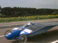 ひまわりをバックに疾走するソーラーカー