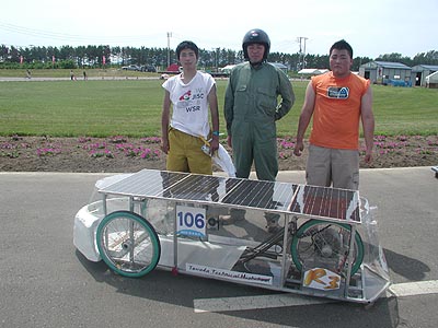 2001年WSBRに先輩方とともに初参加。我々は大会運営ボランティアとして参加させてもらいました。とてもよい経験であり、また満足感でいっぱいでした。しかし、先輩たちの車両TTHSは最高速度コンテスト・マラソン共に良い結果が出ず終えてしまいました。今年は、我々生徒手作りの車両R3でチャレンジします!